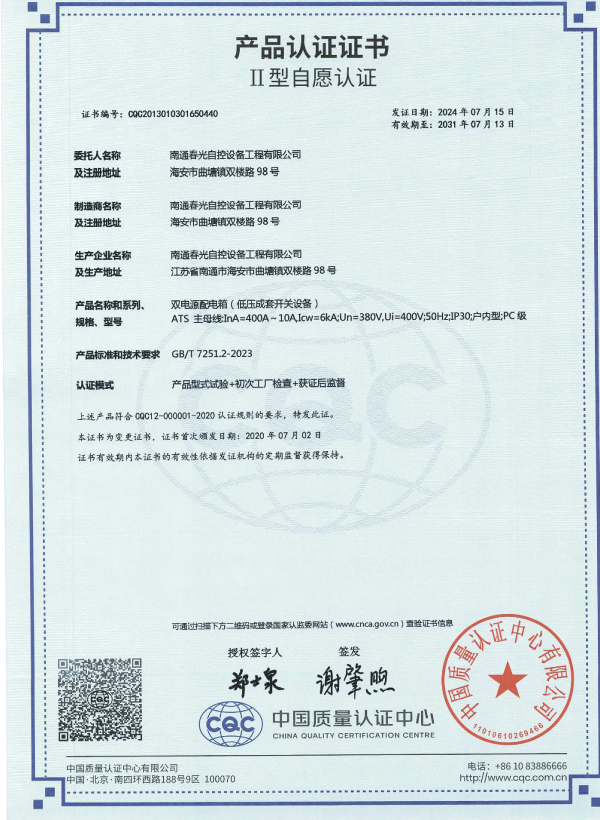 雙電源配電箱認證證書